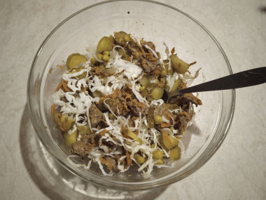 Приготовила салат с говяжьей печенью и солеными огурцами с небольшими изменениями. Вместо салата айсберг, которого у меня просто нет, я добавила тонко нашинкованную белокочанную капусту. Вместо сыра чеддер положила копчёный сыр сулугуни. Печень обжарила с добавлением лука и морковки. Соленых огурчиков положила побольше и ещё от себя добавила консервированный зелёный горошек. Смешала всё ингредиенты, заправила и салат готов. Заправка великолепная, салатик получился ароматный и насыщенный вкусами. Печень нежная и мягкая, капуста с огурцами хрустящие, горошек нежный, копчёный сыр придал особого аромата. Необычное для меня сочетание, но насколько это всё гармонично и аппетитно. Салат великолепный! Кушали как самостоятельное блюдо с ломтиком бородинского. Большое спасибо автору!