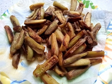 Обжариваем баклажаны на среднем огне, перемешивая лопаткой, в течение 10 минут, до легкого румянца.