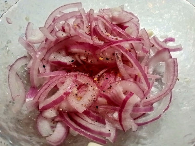 Репчатый лук чистим от шелухи и мелко нарезаем ножом. Репчатый лук для такого салата можно использовать любой по вкусу, не нужно бояться, что попадется горький лук. После маринования лука в смеси из уксуса любая горечь из луковицы улетучится.