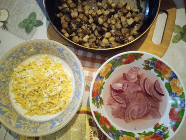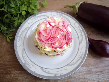 Очень люблю баклажаны. Готовлю их в любом виде и ещё замораживаю на зиму. Нашла на любимом сайте интересный вариант салата с баклажанами. Решила попробовать. Яйца отварила заранее. Лук выбрала фиолетовый для красоты, он ещё и сладкий. Замариновала лук по описанию в рецепте. Баклажан порезала кубиками и пожарила на постном масле до румяности, добавила чеснок и посолила. Яйца не разделяла на желтки и белки, а просто натёрла. Выложила салат в два кулинарных кольца слоями по описанию в рецепте, перемазывая майонезом. Настаивался мой салатик пару часов в холодильнике. Получилось не только красиво, но ещё и очень вкусно, и сытно, и ароматно.