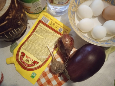 Приготовим ингредиенты для салата. Основу блюда составляют баклажаны, куриные яйца и репчатый лук. Если эти ингредиенты подготовить заранее, то простота дополнится еще и быстротой приготовления салата.