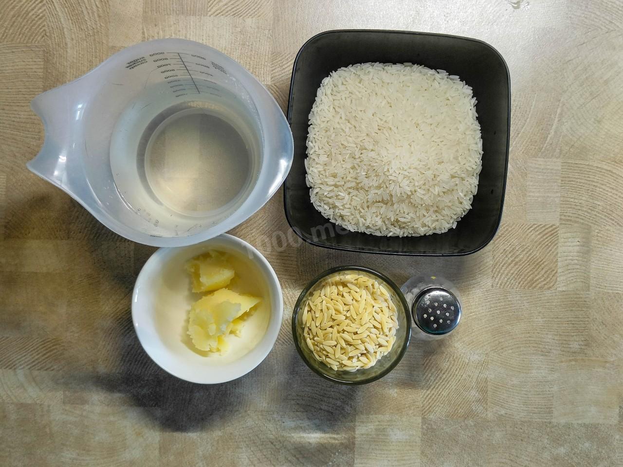 Подготовьте необходимые ингредиенты. Рис тщательно промойте в нескольких водах до прозрачности воды (это ключ к рассыпчатому рису, так уйдёт лишний крахмал) и откиньте на дуршлаг, чтобы стекла лишняя вода. Про выбор риса и особенности его приготовления читайте статью под шагами. Масло я взяла топленое, оно тоже придает сливочный аромат и вкус. Можно использовать и растительное, но вкус будет другой. Подробнее про выбор масла читайте в материалах под шагами