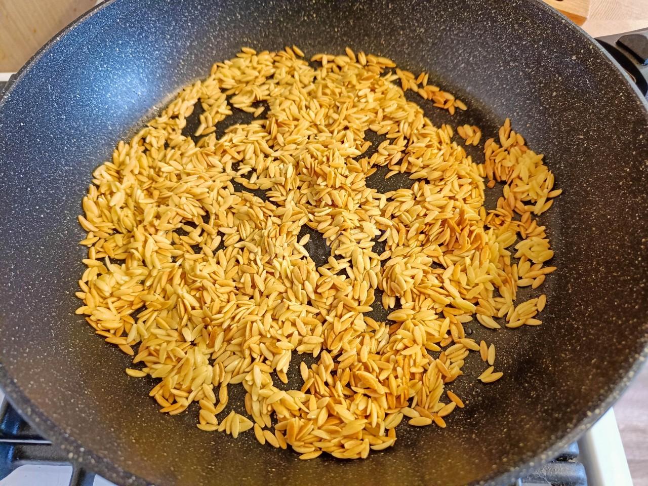 В растопленное масло высыпьте всю пасту орзо. Обжарьте её на среднем или малом огне до зарумянивания. На этом этапе важно помешивать и постоянно контролировать состояние макарон. Они не должны пригореть, а только равномерно зарумяниться со всех сторон, иначе вкус не получится таким, как должен быть. Этот процесс занимает около 3-4 минут.