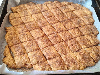 Смешайте сахар и корицу и равномерно присыпьте всю поверхность теста. Лучше для этого взять среднее сито, так получится равномернее. Чтобы посыпка закрепилась, можно пройтись сверху скалкой, не надавливая очень сильно. Отправьте печеньем в разогретую духовку на 15 - 25 минут в зависимости от румяности печенья. Точное время зависит от вашей духовки. Узнать об особенностях работы духовок можно, прочитав отдельную статью, ссылка в конце рецепта.