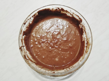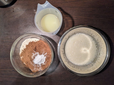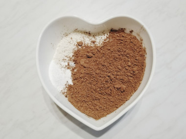 В сухую миску просеиваем муку, добавляем разрыхлитель и какао. В пачке какао часто бывает комками, в этом случае его также рекомендуется просеять через сито. Смешиваем сухие ингредиенты и небольшими порциями подмешиваем остальную просеянную муку. Смешиваем сухой ложкой до тех пор, пока масса не станет однородной по цвету.