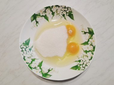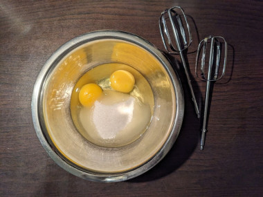 В отдельную посуду разбиваем яйца (лучше добавлять их по одному, чтобы исключить риск попадания не свежих). Добавляем сахар, соль, взбиваем до увеличения объема и побеления массы.