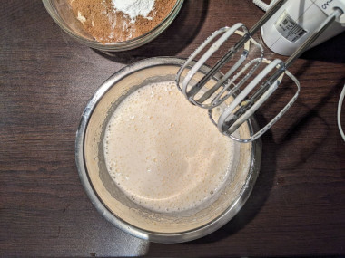 Сначала взбила миксером яйца с сахаром до густой пены, затем добавила кефир и масло.