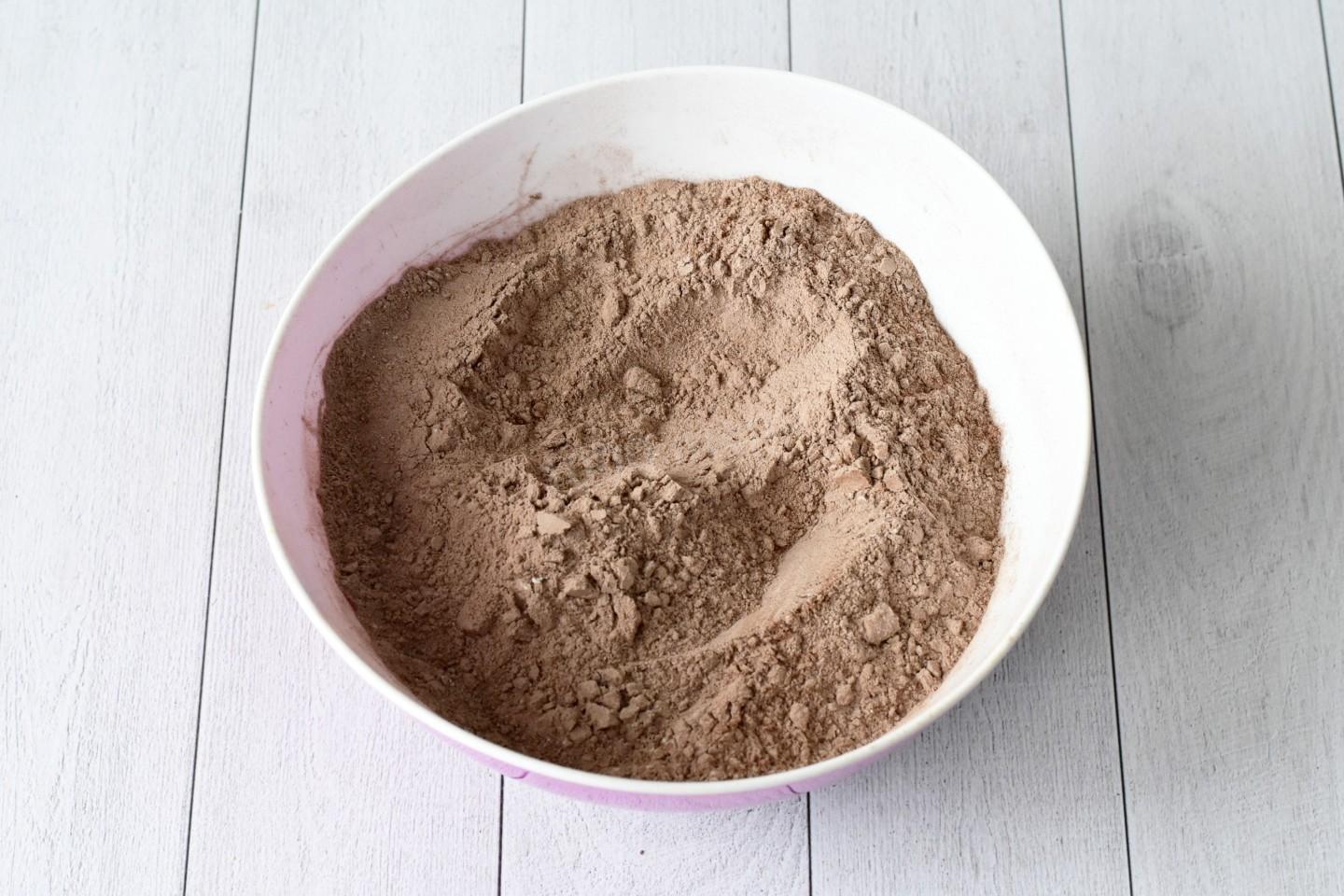 В отдельную миску просейте муку с какао и разрыхлителем и перемешайте. Какао берите качественное, желательно алкализованное. Алкализованное какао (обработанное щелочью) придаст выпечке глубокий шоколадный вкус и насыщенный темный оттенок, в то время как обычный какао-порошок может дать более светлый и менее выраженный цвет. Информацию о какао вы найдете в статье по ссылке под шагами.