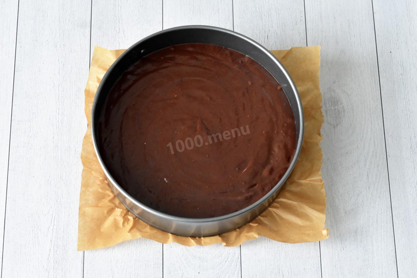 Частями всыпьте просеянную муку с какао и разрыхлителем муку, перемешивая тесто миксером до однородности. Тесто должно получиться густое, но текучее. Вылейте тесто в застеленную пергаментом форму для выпечки (Ø 20-22 см).