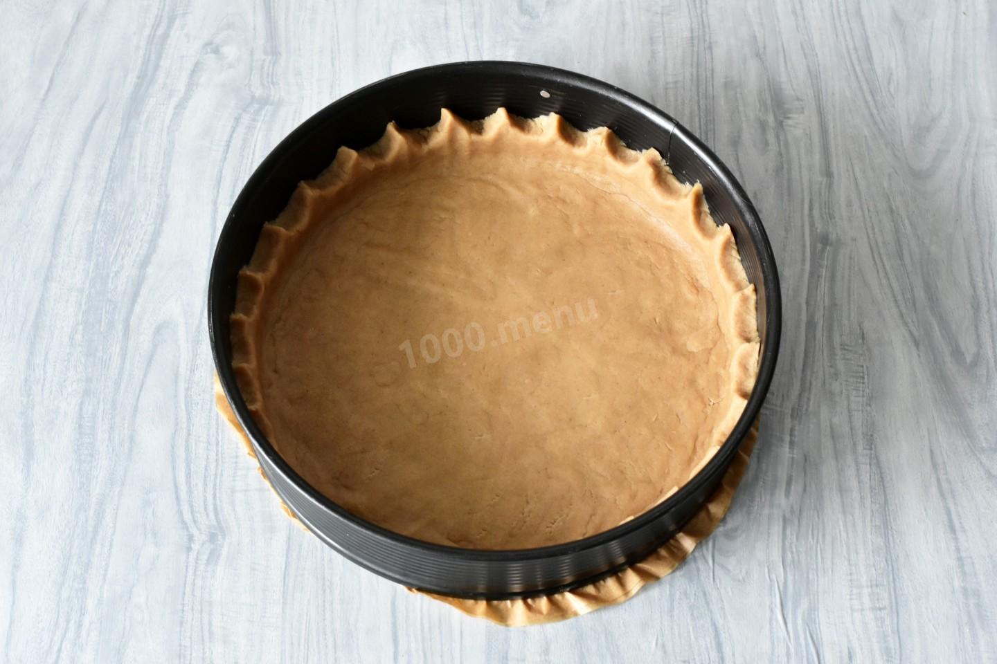 Тесто разделите на две неравные части. Большую часть теста распределите по застеленной пергаментом форме для выпечки (Ø 24 см) и сделайте невысокие бортики. Поставьте форму в холодильник на 30 минут. Меньшую часть теста также уберите в холодильник. С выбором формы для запекания и пергаментом помогут статьи по ссылкам в конце рецепта.