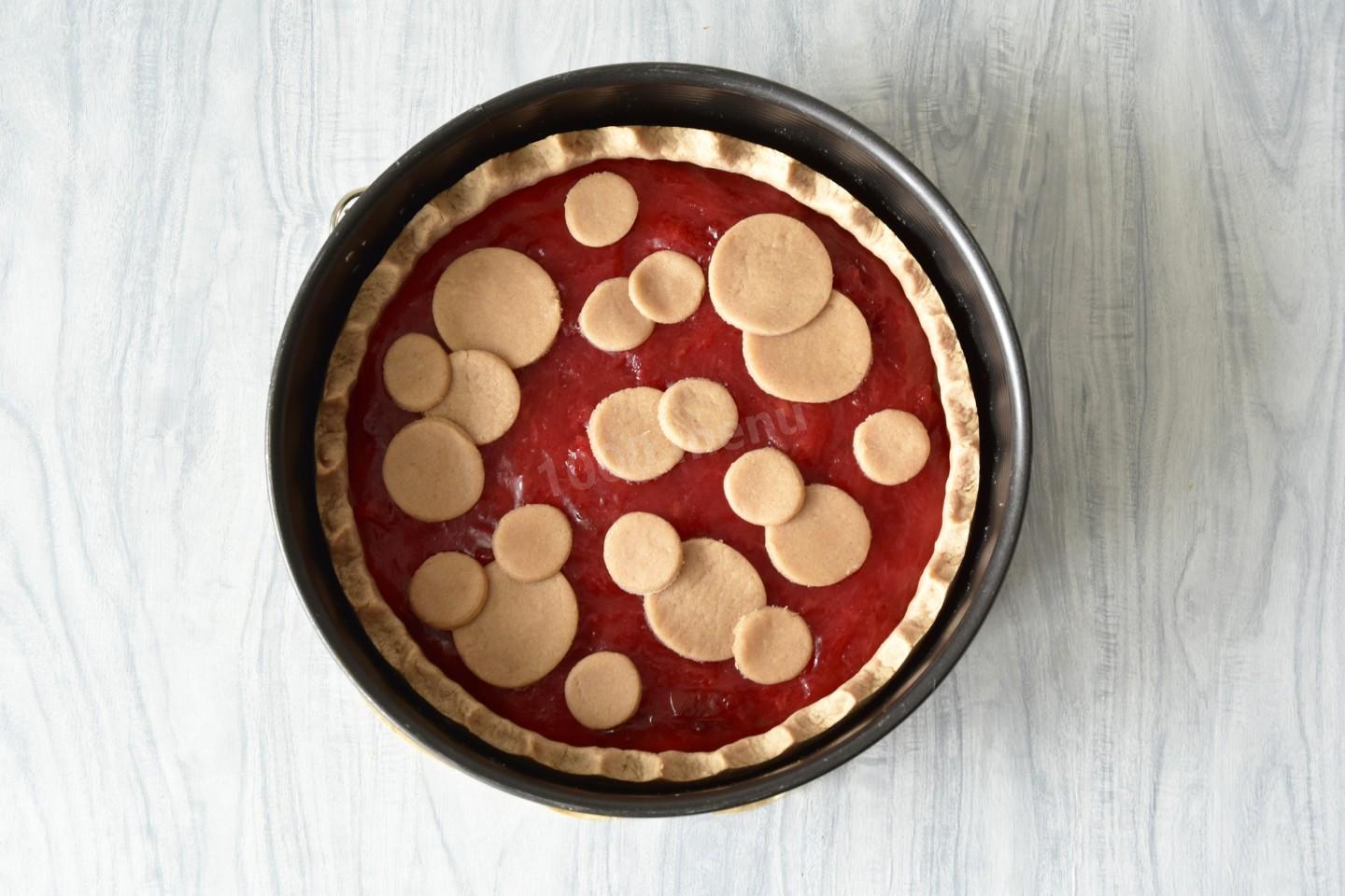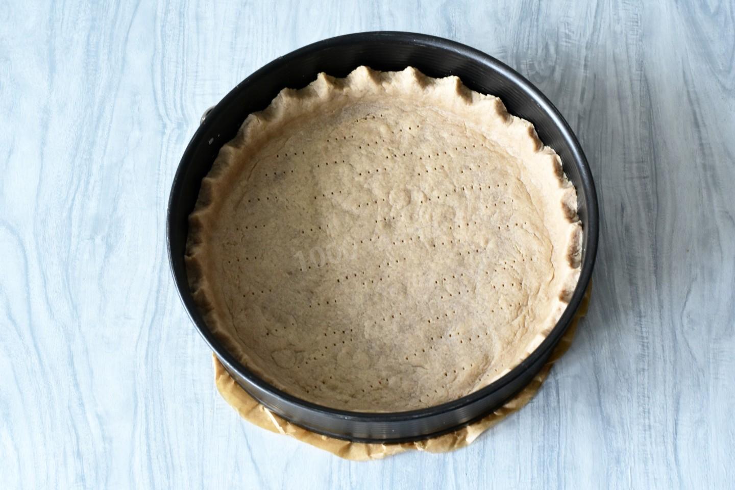 Охлажденную основу пирога наколите вилкой и поставьте в предварительно разогретую до 180℃ духовку на 12-15 минут.