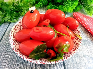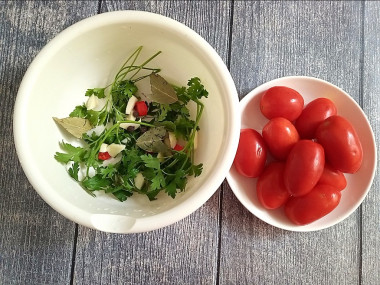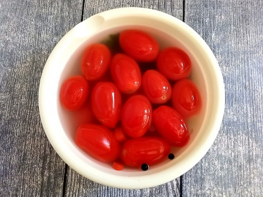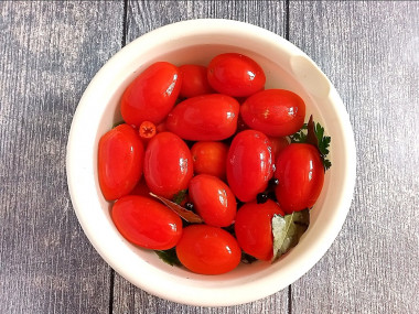 У меня было немного помидорок - сливок, захотелось засолить их так, чтобы поесть сейчас. Выбрала рецепт моченых помидоров в кастрюле на зиму. Квасила их в пластиковой миске с крышкой.