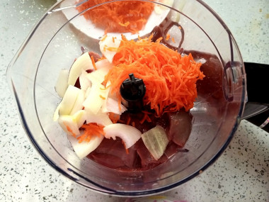 Очистите и нарежьте небольшими кусками лук. Измельчите печень вместе с луком при помощи блендера или кухонного комбайна. У меня чаша измельчителя блендера маленькая, поэтому я делала это в несколько подходов. Печеночную массу переливайте в одну большую миску.