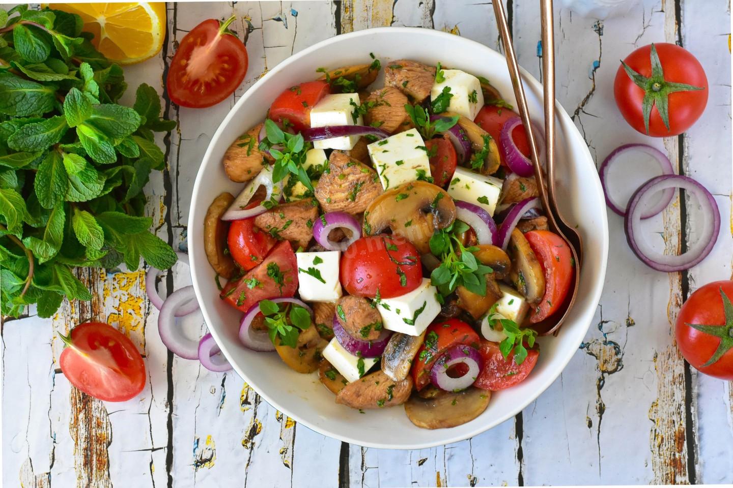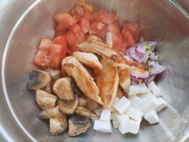 В миске соедините курицу, помидоры, грибы, красный лук. Полейте салат заправкой и перемешайте. В конце добавьте ломтики феты. Салат с грибами, курицей и помидорами подайте к столу. Приятного аппетита!