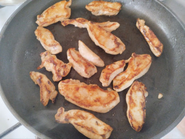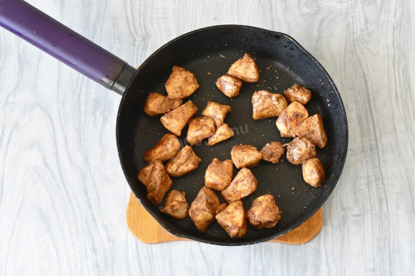 Сковороду снова разогрейте на сильном огне. Выложите курицу вместе с маринадом и обжарьте, помешивая, около 10 минут до готовности. Вместо обжаривания можете филе отварить или запечь в духовке в фольге. Вместо свежей курицы можете использовать копченую.
