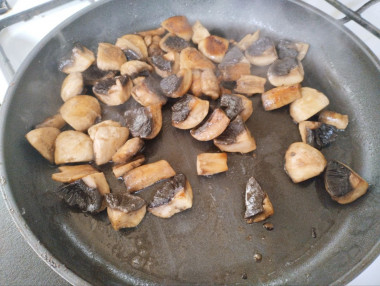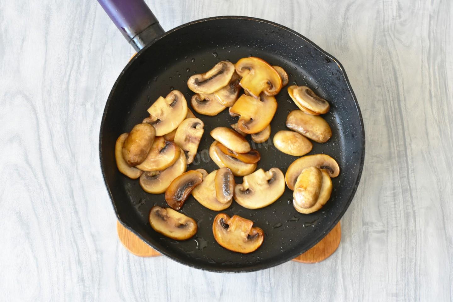 Шампиньоны вымойте, обсушите и нарежьте пластинками. В сковороде разогрейте растительное масло и обжарьте грибы до золотистого цвета. Переложите грибы в миску и охладите. Как выбрать сковороду и растительное масло читайте в отдельных статьях. Ссылки в конце рецепта.