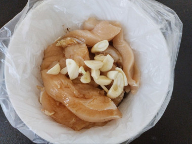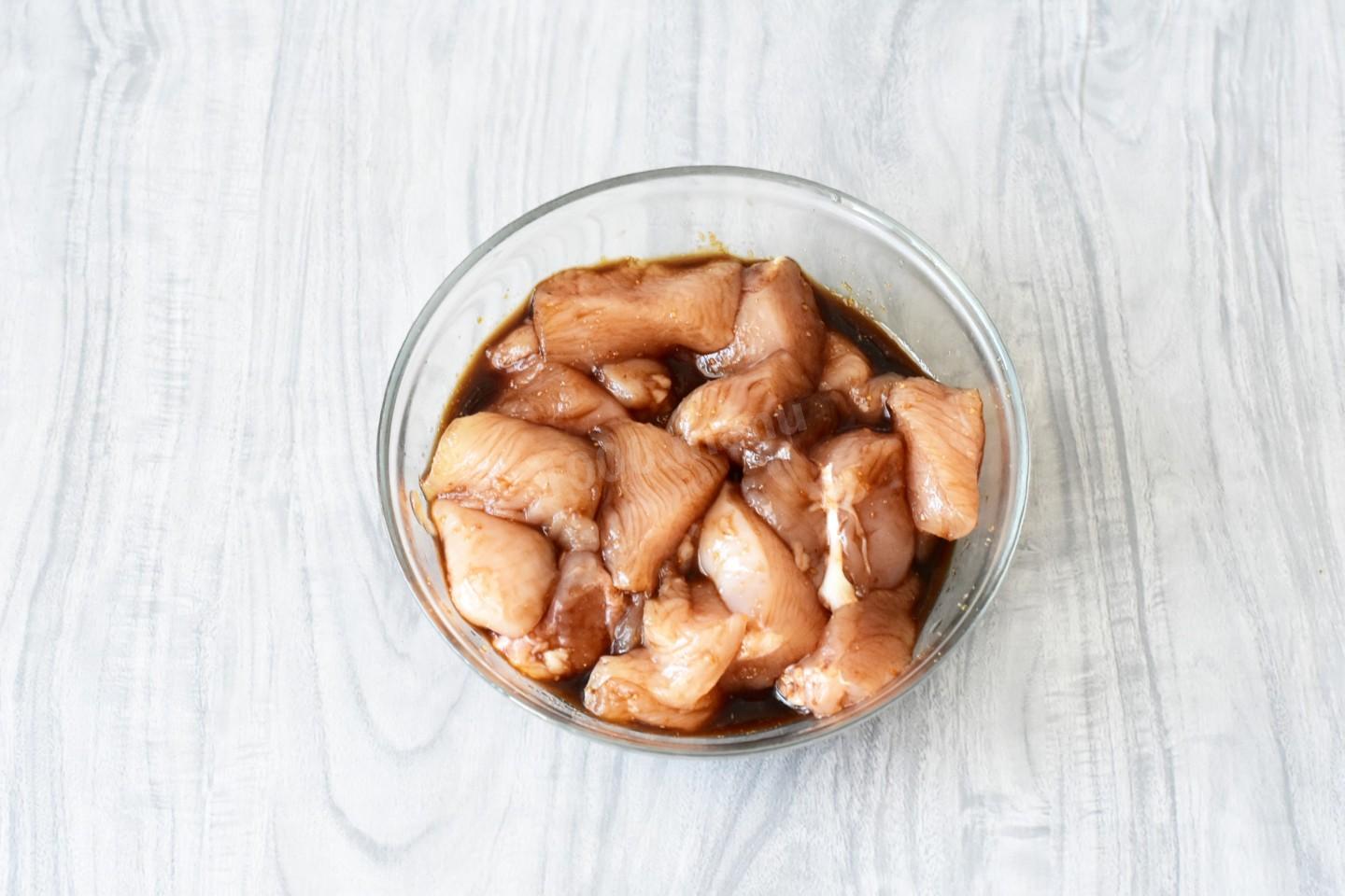 Куриное филе вымойте, обсушите и нарежьте средними кусочками. В курицу добавьте соевый соус и сухой чеснок и перемешайте. Можете также добавить специи по своему вкусу. Оставьте курицу мариноваться на 30 минут.