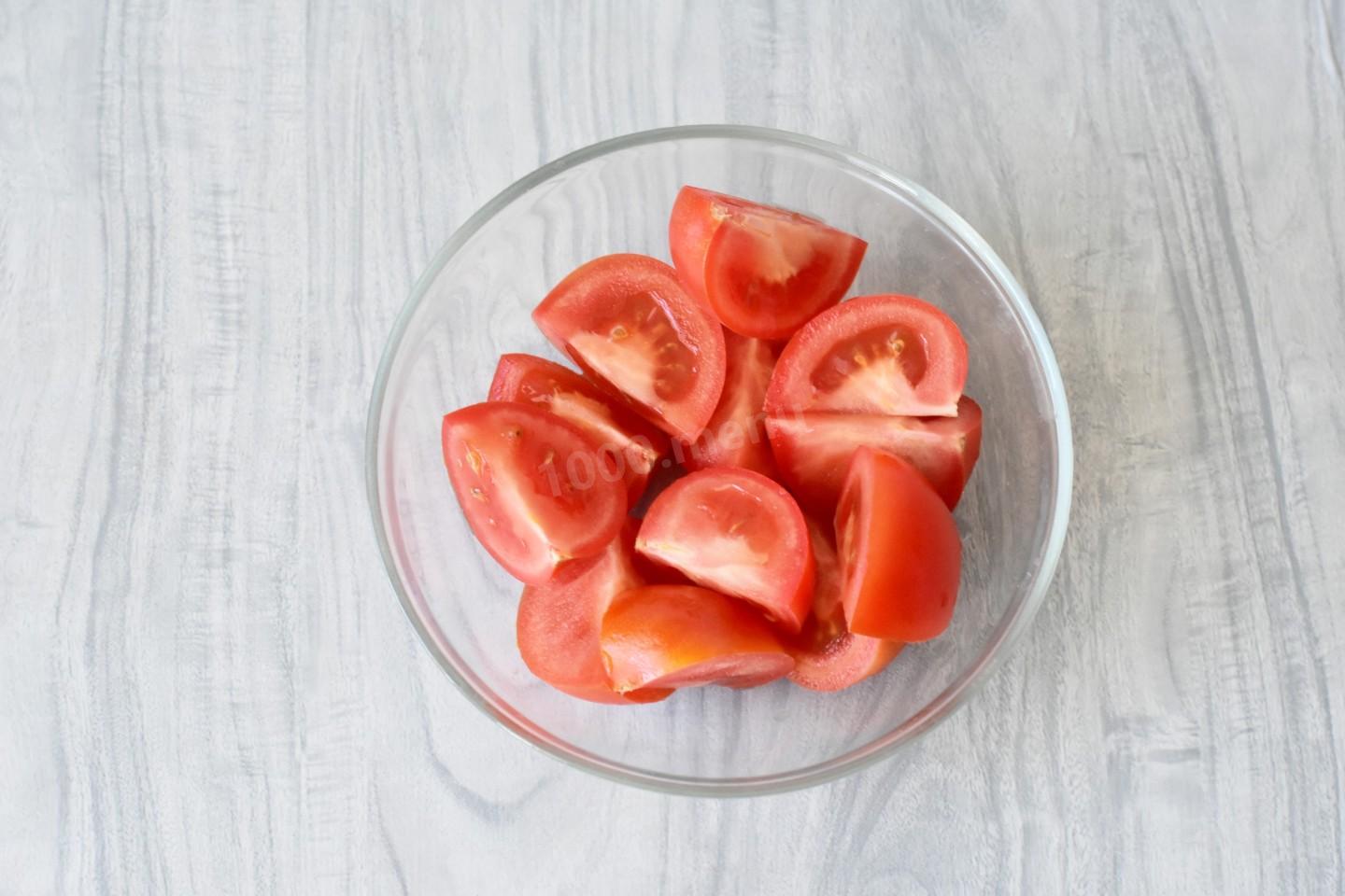 Помидоры нарежьте дольками. Помидоры можете использовать любые. У меня небольшие душистые бакинские помидорчики. Если у вас черри, разрежьте их пополам. Помидоры выбирайте спелые, но плотные. Мягкие плоды плохо держат форму, в процессе нарезки и приготовления они расползутся в бесформенную массу и испортят внешний вид блюда.
