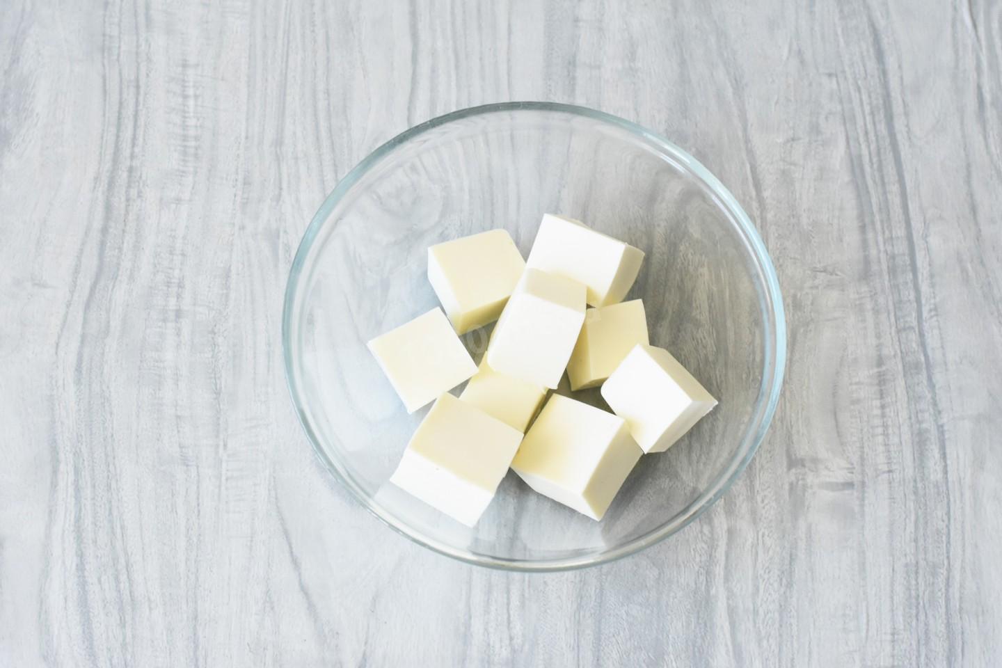 Фету нарежьте кубиками. Фету можете заменить на моцареллу, брынзу или другой сыр по вашему вкусу. О том, как правильно заменять различные виды сыров читайте в статье, ссылка под рецептом.