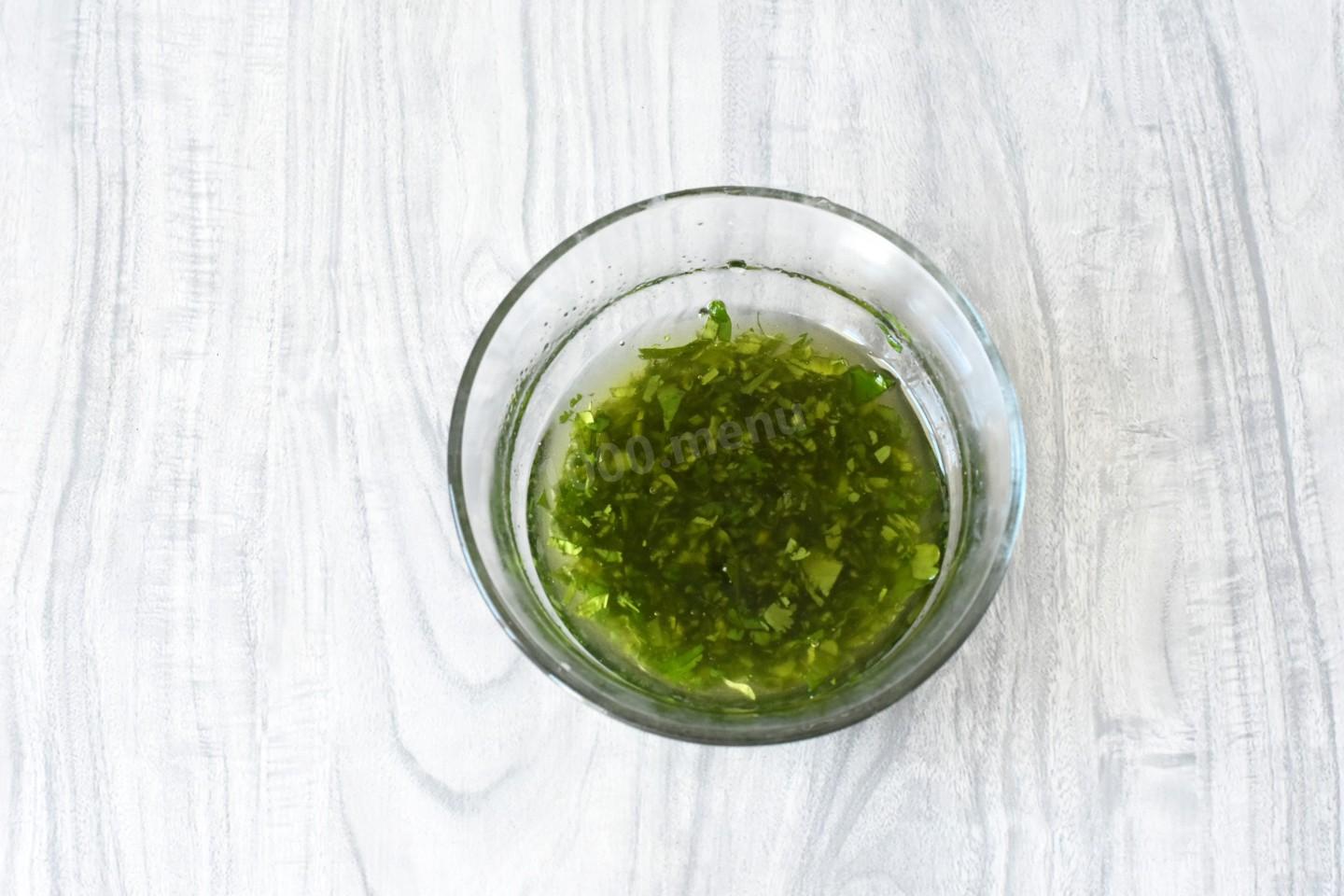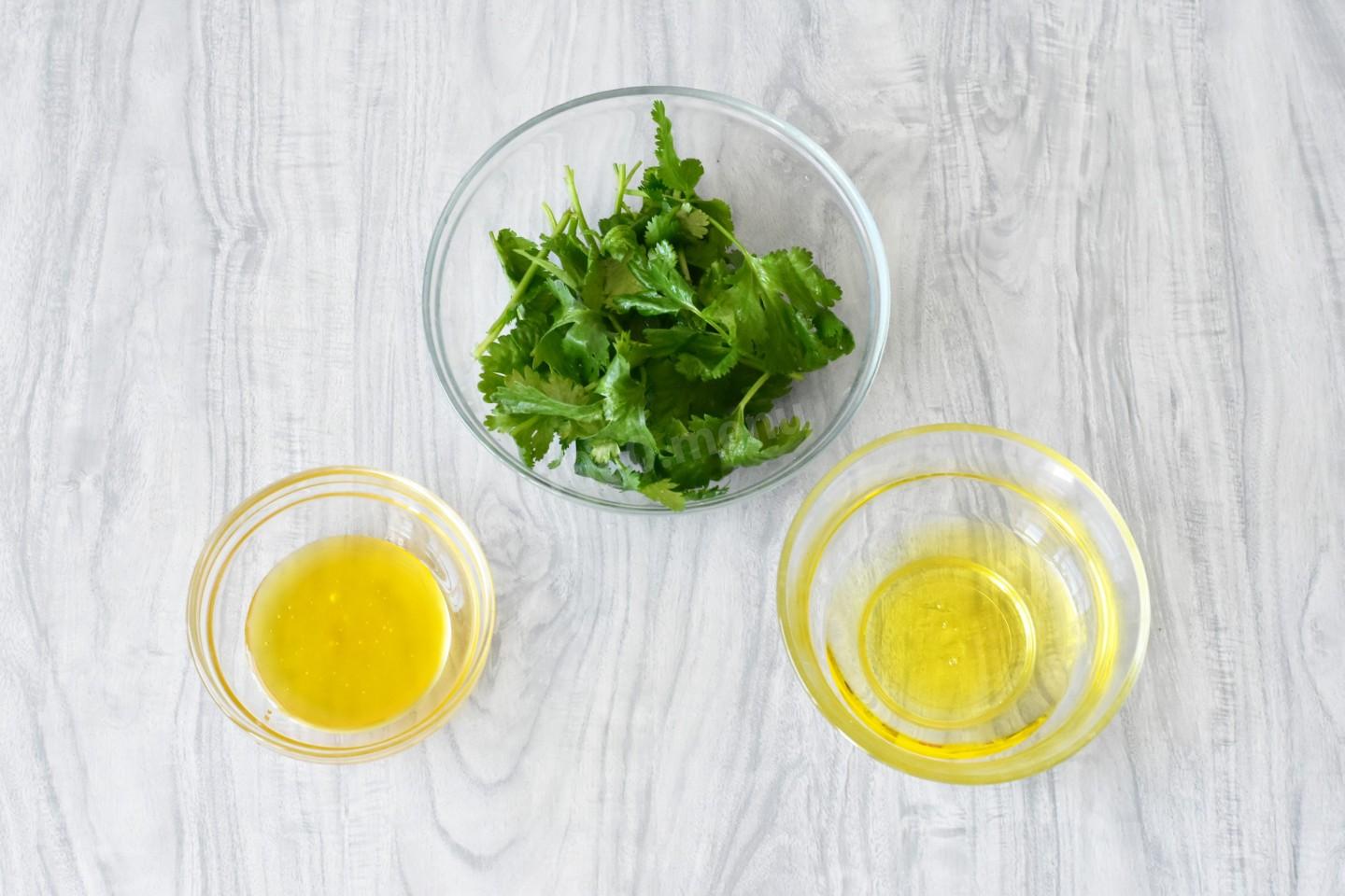 В мисочке соедините оливковое масло, мед, кинзу и взбейте до однородности.