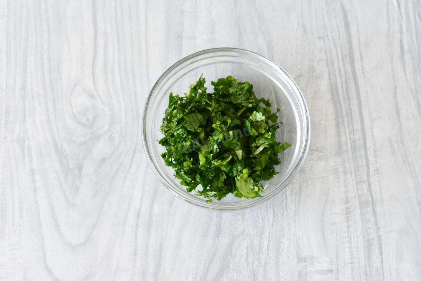 Кинзу вымойте, обсушите и мелко нарежьте. По желанию можете заменить или дополнить другой зеленью, например, укропом, петрушкой или использовать смесь разных трав.