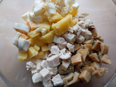 Куриную грудку отварите в кипящей воде, в течении 30 минут. Затем остудите. Остывшее куриное мясо нарежьте кубиками.