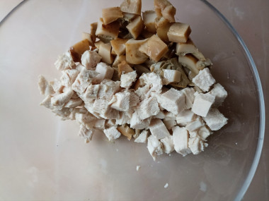 В чаше для приготовления салата соедините нарезанное мясо курицы и соленые грибы.