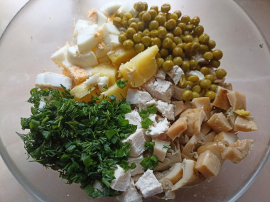 Как сделать салат с солёными груздями? Подготовьте для этого все необходимые ингредиенты. Заранее отварите яйца, картофель в мундире и куриную грудку. Яйца необходимо проварить в кипящей воде 7-8 минут, затем охладить, залив холодной. Соленые грибы пролейте кипятком, чтобы смыть лишнюю соль. Если грибы крупные, то нарежьте их на кусочки. Откройте банку консервированного горошка и слейте жидкость. Свежую зелень ополосните в проточной воде.