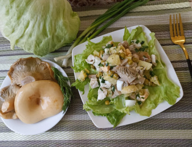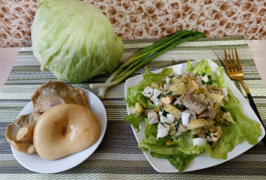 Прикольное сочетание курица+грузди. Все остальное обычное. Сначала сомневался заправлять оливковым маслом, хотел с майонезом сделать, но решил от рецепта не отступать. Получилось вкусно! Спасибо за салат с солеными грибами груздями!