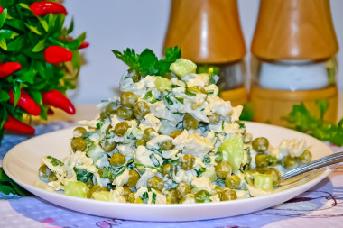 Свежую зелень мелко нарежьте. Для салата я использую свежий укроп и перышки зеленого лука. Добавьте в чашу к салату измельченную зелень и консервированный горошек.