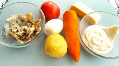 Первый раз делаю такой салат Красная шапочка с помидорами. Все продукты доступные и почти всегда под рукой. Я отварила картошку, морковку и яйцо. Вместо филе сняла мясо с жареной куриной спинки. Майонез приготовила сама за пару минут. Овощи натерла на терке, смешала с курицей и майонезом, добавила соль. и выложила в пленку в глубокую пиалу. Аромат курицы и овощей так и манит попробовать. Консистенция салата с майонезом получилась очень нежная, чуть влажная, мягкой текстуры из-за натертых овощей, салат очень легкий для усвоения. Пиалу переворачиваю на плоскую тарелку, снимаю пленку, посыпаю натертым голландским сыром. Помидорок черри у меня не было, поэтому украшаю дольками обычных. Из указанного количества продуктов у меня получилась "шапка" примерно на две порции. Спасибо автору за такой замечательный рецепт, рекомендую всем приготовить такой салат.