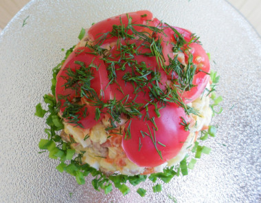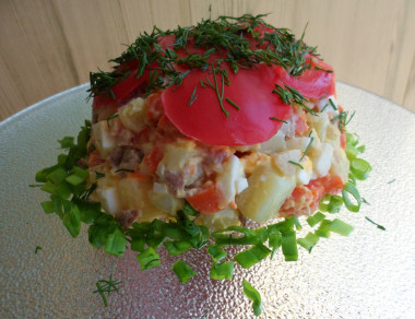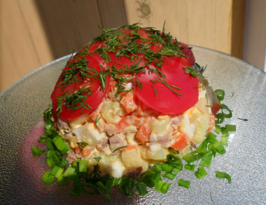 Превосходный праздничный салат Красная Шапочка с помидорами порадует и вас, и гостей! Очень хорошее сочетание ингредиентов. Готовится просто, аппетитно выглядит, сытный, вкусный и сочный.Спасибо за рецепт, нам было вкусно!