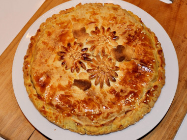 Часть теста для верха раскатайте аналогично первой и выложите ее на начинку. Края теста хорошо соедините. В центре пирога сделайте отверстие для выхода пара во время выпечки.