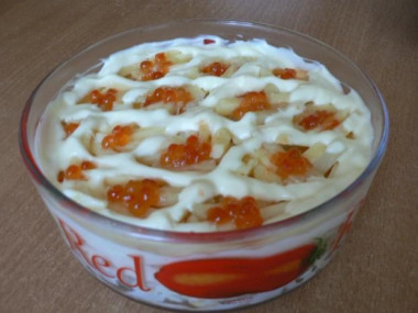 Я впервые делала такой салатик, и могу сказать, что он очень классный! Вкус кальмаров и красной икры прекрасно сочетается с острым сыром и кисло-сладким яблочком. Точно буду готовить его ещё раз.