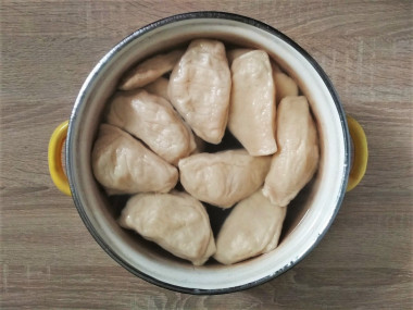 На сильном огне доводим до кипения воду, добавляем немного соли и загружаем вареники. Убавляем огонь до среднего и варим 3-4 минуты до полуготовности. По прошествии времени достаем шумовкой либо отбрасываем на дуршлаг.