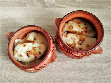 Подаем запеченные вареники с картофелем в горячем виде прямо в горшочках.
