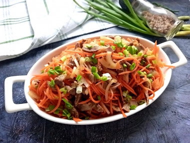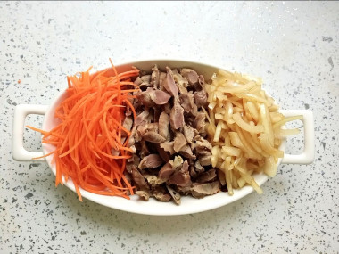 Сами желудки тщательно почистила, промыла и залила водой. Довела до кипения и слила первый бульон. Затем залила желудки кипятком и варила два часа до мягкости. В кастрюлю добавляла соль, душистый перец и в конце лавровый лист. Пока желудочки охлаждались нарезала лук и замариновала его в смеси соевого соуса, сахарной пудры и уксуса. Кстати уксус брала яблочный 6%, нам как раз по вкусу. Пока резала желудочки решила ещё и морковку добавить для сочности и яркости. Натерла её на терке для корейских салатов. Готовую закуску попробовала и добавила соевого соуса и немножко красного перца. Получилось просто потрясающе вкусно! А на следующий день вообще не оторваться!