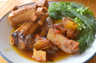 Подавайте свиные ребра с картофелем горячими, украсив при желании веточкой укропа. Приятного аппетита!