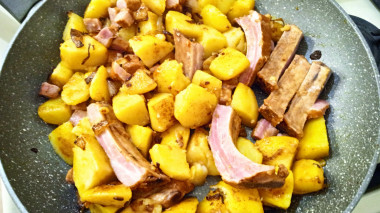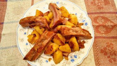 Свиные ребрышки с картошкой на сковороде очень понравились всем членам моей семьи. Готовится просто, достаточно быстро. Получается сытный и вкусный ужин. То, что и нужно