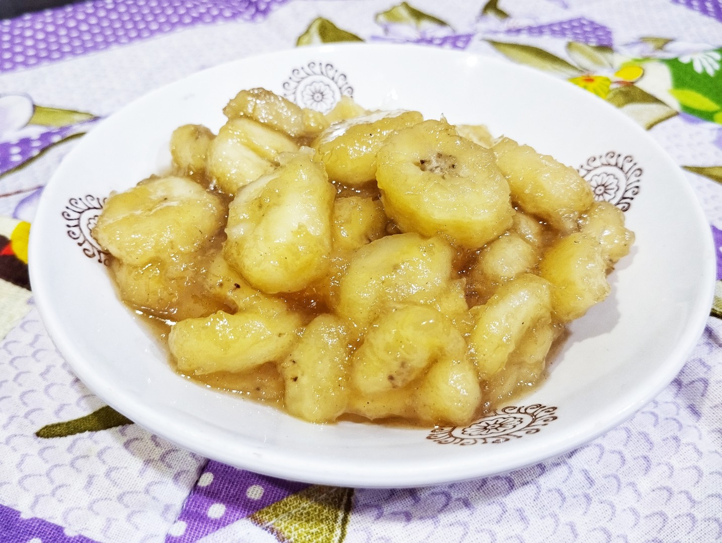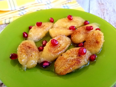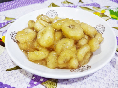 Случайно увидела на сайте интересный рецепт карамелизированных бананов и захотелось приготовить эту вкусняшку на десерт. У меня был крупный спелый банан. Для сиропа взяла в половину меньше продуктов. Делала все как написано в описании, следуя шагам. После добавления на сковороду воды действительно сироп стал пузыриться и шипеть. В этот момент выложила толстые ломтики бананов на сковороду. Вот здесь есть один момент - жидкость стреляет и разбрызгивается. Поэтому нужно быть внимательным, чтобы не обжечься. А лучше взять сковороду или сотейник с высокими бортами. Бананы жарились не больше минуты с каждой стороны. При этом видно как одна сторона становится прозрачной, значит пора переворачивать. На моем фото видно как зарумянилась карамель, в этих местах она хрустящая. Даже когда перекладывала бананы на тарелку, от сковороды тянулись прозрачные карамельные нити) Десерт получился вкусным, сладким и очень ароматным.