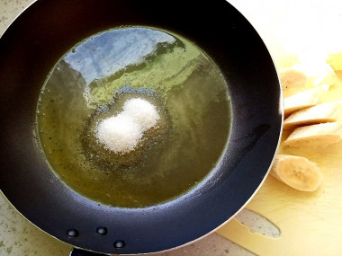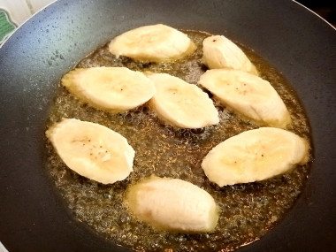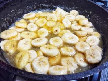 Выложите в горячую карамель нарезанные бананы. Готовьте их в течение минуты на медленном огне. Если вы используете мягкие бананы, уменьшите время жарки.