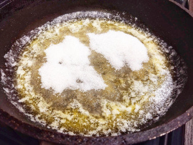 Всыпьте в растопленное масло сахар. Перемешайте и оставьте греться еще несколько минут. Вместо сахара можно использовать сахарозаменитель, который не боится термической обработки. Подробнее читайте по ссылке под рецептом.
