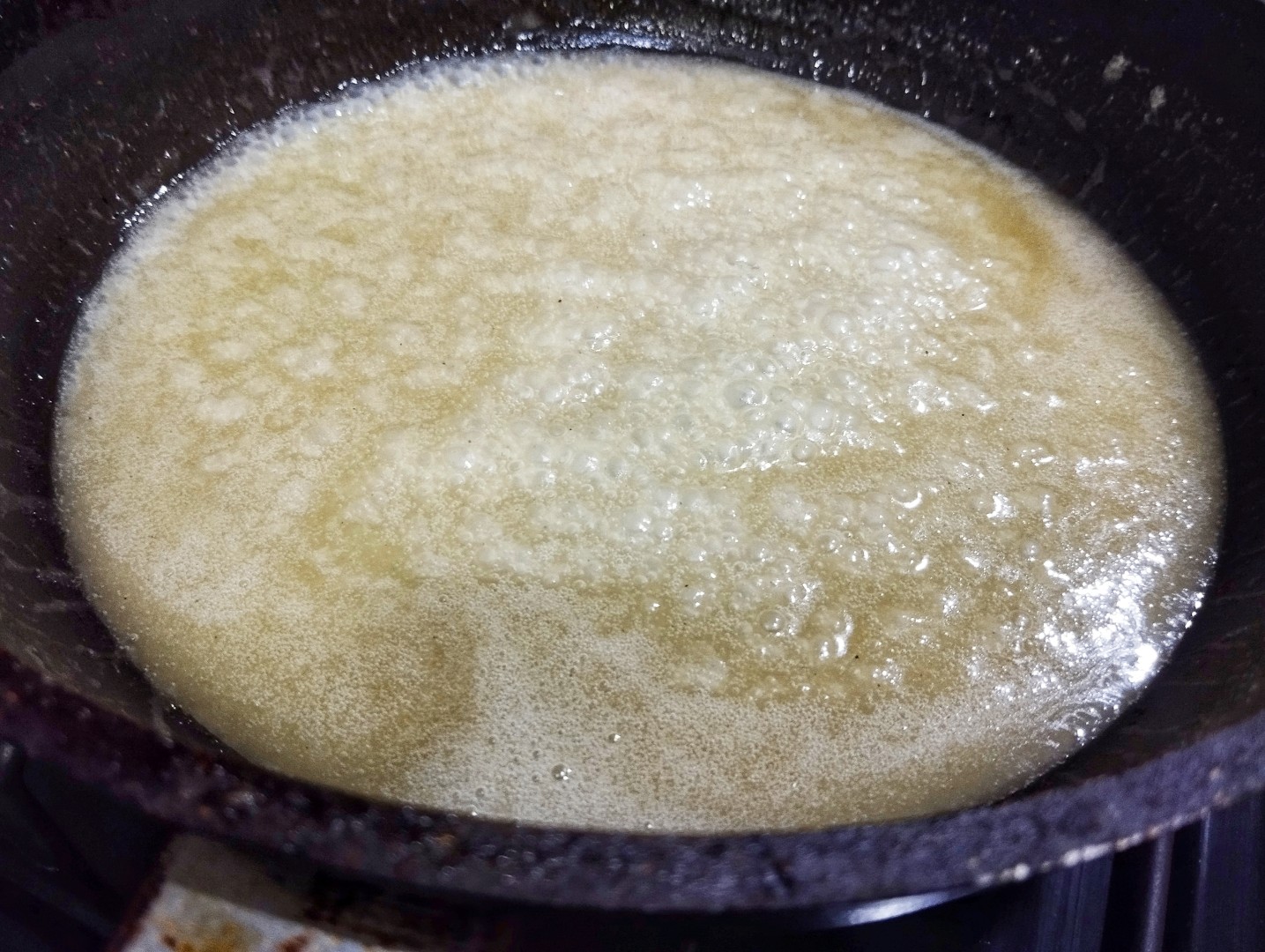 Сахар будет таять и начнет приобретать золотистый цвет. Масса начнет пениться. Не допускайте, чтобы сахар подгорел. Перемешивайте массу деревянной лопаткой.