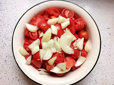 Лук очистите от шелухи, ополосните и обсушите бумажным полотенцем. Нарежьте лук кубиком и добавьте к помидорам. Если вы не представляете кетчуп без чеснока, то его надо добавлять тоже в этот момент, предварительно очистив и измельчив.