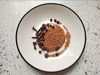 Из специй у меня зерна горчицы, гвоздика, черный и душистый перец. Корицу мы не любим, не стала ее добавлять. Хотя любителям такого сочетания вкус придется по душе. Марля у меня закончилась, поэтому завязала все это в чистую хлопковую ткань.
