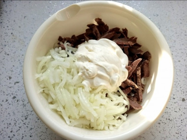 Маринованный лук отжимаем от воды и добавляем к сердцу.