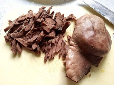 У сердца вырезаем жир, большие сосуды и нарезаем соломкой.