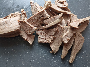 Так как сердце - это большая мышца, то готовится оно долго (1,5-2 часа), поэтому советую позаботится об этом за ранее. А если сердце не доставать из бульона, а дать ему остыть в нем, то сердце будет мягким и сочным. Поэтому, советую, варить его накануне вечером, чтобы оставить его остывать на ночь в бульоне. А уже утром быстренько приготовить салат.