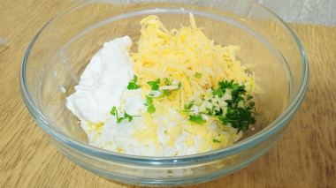 В салатнике соедините тертые белки, один тертый желток, сыр, чеснок и петрушку.