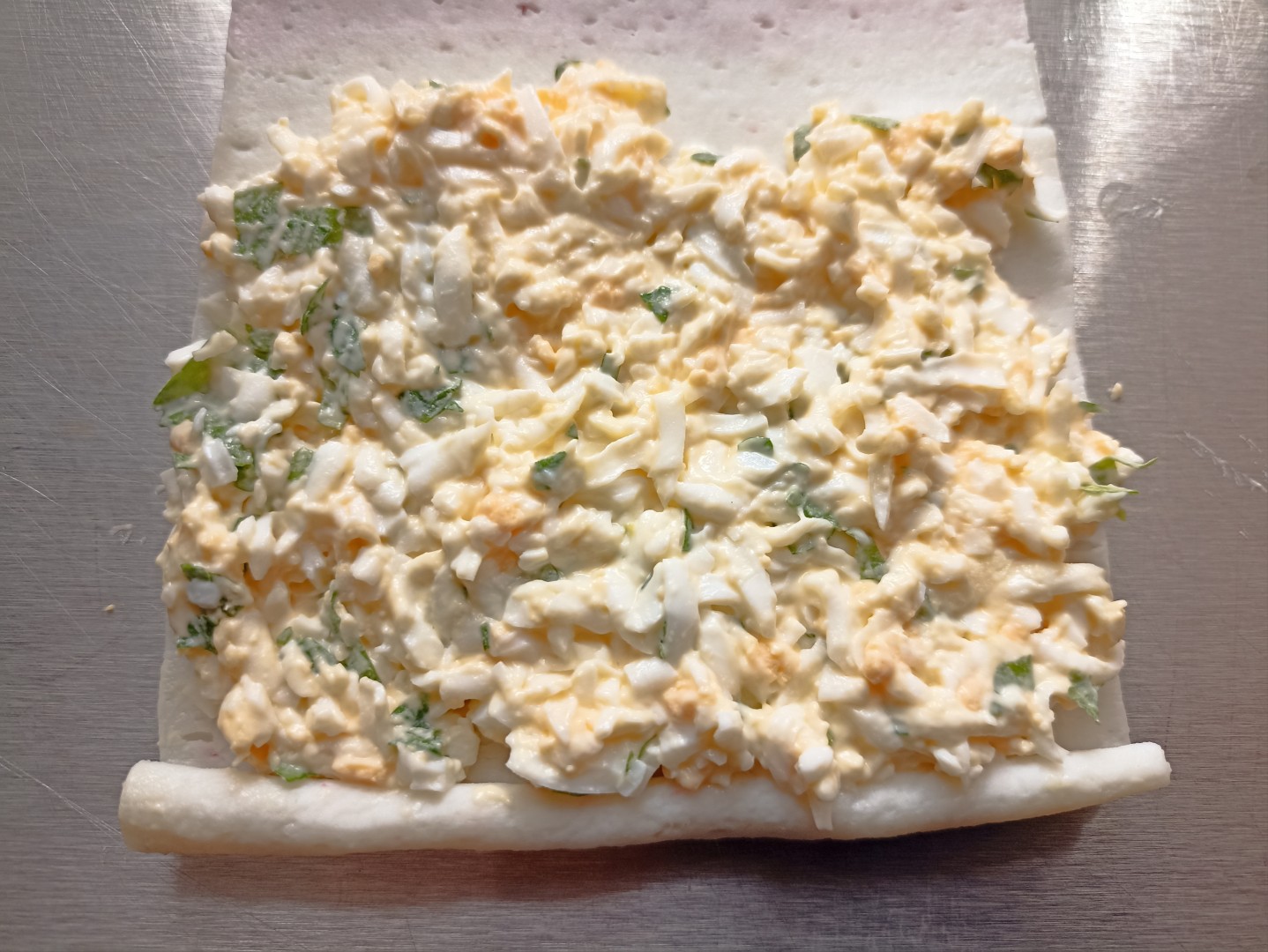 Не перегружайте палочки начинкой, иначе их будет сложно свернуть, и они могут порваться. Слой начинки должен быть примерно 3-4 мм.